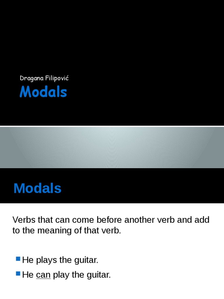 The modal verbs in english grammar are can, could, may, might, must, need not learn about the usage of modal verbs and their alternative forms in english grammar with lingolia's online lesson modal verbs. Try our newest study sets that focus on modal verbs to increase your studying efficiency and retention.